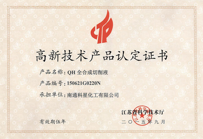 高新技術產(chǎn)品認定證書-QH全合成切削液